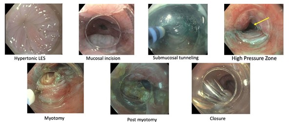 - Procedure involves endoscopic mucosal incision, creation of submucosal tunnel with performance of myotomy of lower esophageal sphincter (LES), and closure with endoscopic clips, all without external incisions.